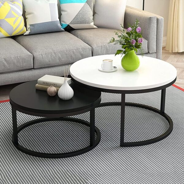 • There are two tables in a round coffee table: one large and one mini. To save room, a smaller table might be positioned beneath the larger one.