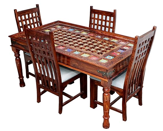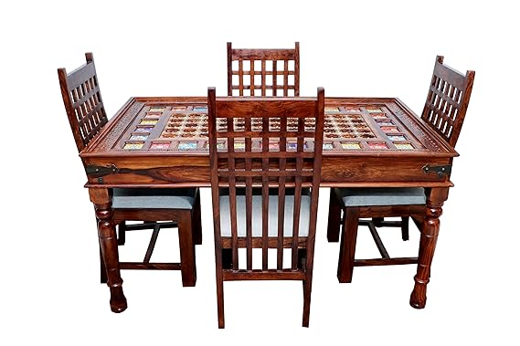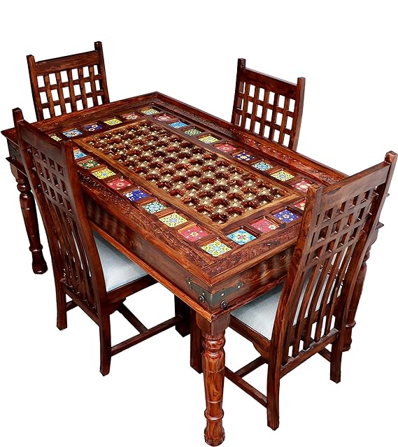 Advika Handicraft Sheesham Wood Antique Brass Design with Tile Work 4 Seater Dining Table with 4 Chair for Living Room