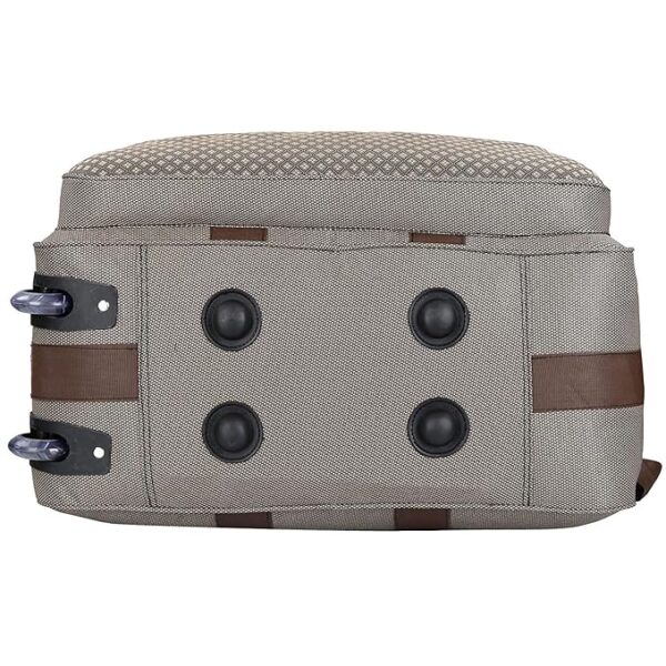 Outer Material: Nylon, Color: Brown Dimensions: 56 cms x 28 cms x 33 cms (LxWxH) Number of compartments: 5 – ( 1 main compartment ,2 front, 2 side) Smooth rolling wheels for travel comfort Laptop Compatibility: No Long lasting Nylon fabric for extra durability Extra side corner guards for extra protection when wheels are in use