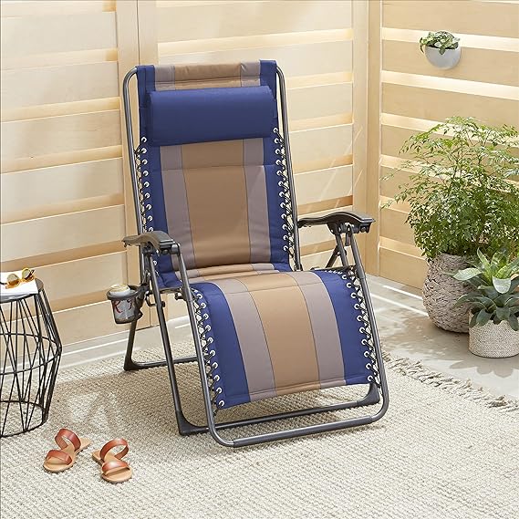 Special Features: Padded, zero-gravity patio chair with mesh seat and high back; removable headrest pillow and handy cup holder; foldable for compact storage and easy transport; safe, sturdy construction