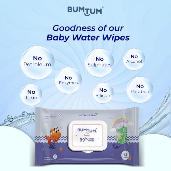 - Paraben & chemical-free: The Bumtum baby water wet wipes are paraben, sulfates, toxins, enzymes, petroleum, dye, alcohol, and silicon free, hence they are safe for a baby’s delicate skin. Also, it doesn’t have any chemical content that keeps the skin soft and wetter to be used at any time.