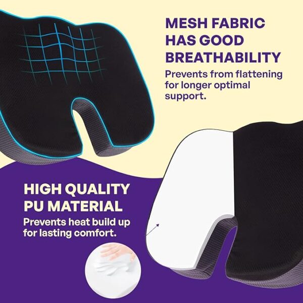 DURABLE SEAT CUSHION FOR CHAIR: This Orthopedic Cushion For Back Pain Relief For Sitting Is Made From Superior PU Material, It Will Not Loose Its Shape After Using For Longer Time Also It Will Not Get Flat After Using Like Other Cheap Coccyx Cushion. This Tailbone Pillow For Sitting Is Made In A Way That Will Regain Its Shape Again