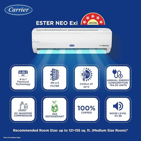 Carrier 1.5 Ton 5 Star AI Flexicool Inverter Split AC (Copper, Convertible 6-in-1 Cooling,Dual Filtration with HD & PM 2.5 Filter, Auto Cleanser, 2024 Model,ESTER Exi, CAI18ES5R34F0,White)