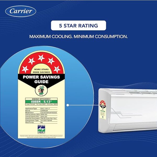 Energy Rating: 5 Star – Best in class efficiency | Annual Energy Consumption (as per energy label): 754.05 units, ISEER Value: 5.13 (please refer energy Label on product page or contact brand for more details)