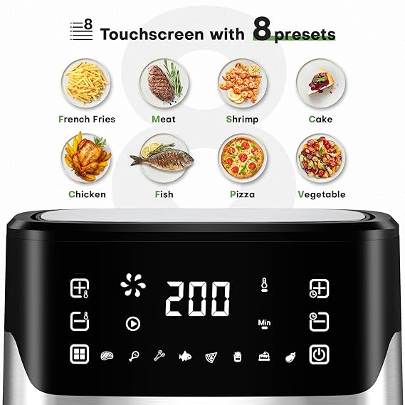 🌽【𝐄𝐚𝐬𝐲 𝐭𝐨 𝐔𝐬𝐞】Take the guesswork out of cooking with the built-in touchscreen menu featuring 8 cooking presets: Fries/Chips, Vegetables, Chicken, Meat, Shrimp, Cake, Fish, and Pizza. Equipped with a wide temperature range from 80°C to 200°C in 10°C increments and a cooking timer for up to 60 minutes. You can effortlessly modify settings during the cooking process, ensuring optimal results for each meal.
