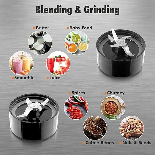 - Blender for fresh and healthy vegetables or fruit juices in seconds and grinder for dry spices and chutney