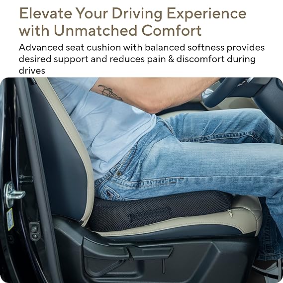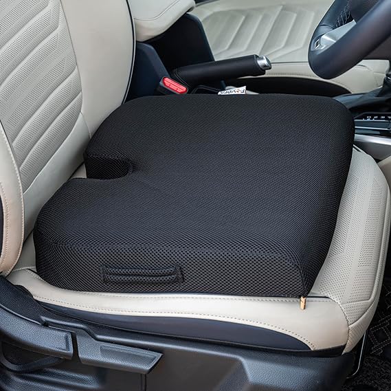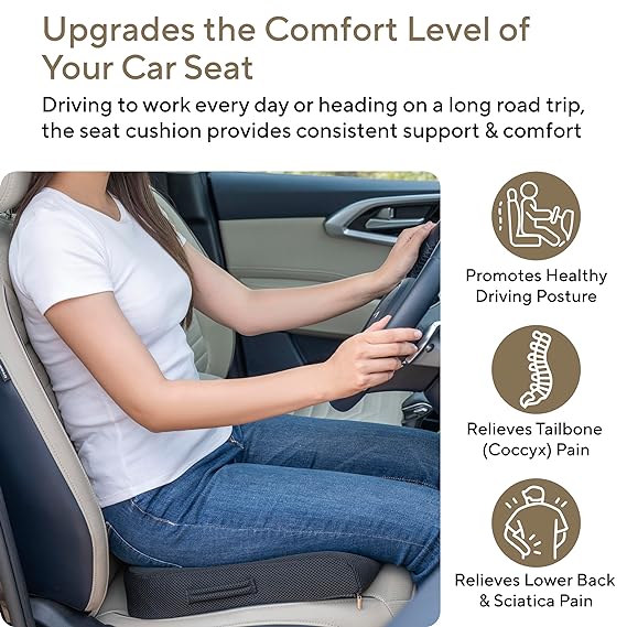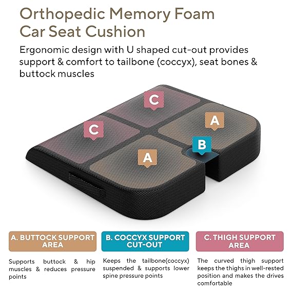 OFFERS SUPERIOR COMFORT: The FOVERA car seat cushion is designed ergonomically with a u-shaped cutout. The cushion relieves pressure from your lower back and tailbone and makes driving more comfortable. The ergonomically designed seat cushion relieves lower back pain, tailbone pain, numbness, and sciatica.