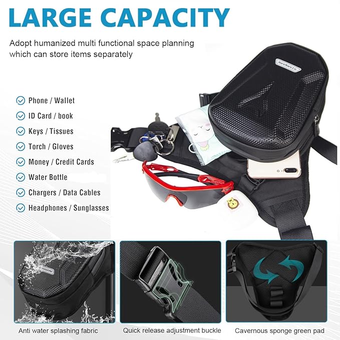 PREMIUM AND DURABLE FABRIC: The waist drop leg bag is made with high-quality EVA and polyester material that is known for its durability and resistance to wear and tear. Hard case ensures the safety of your property, keeping your items from water or scratches. This material ensures that your bag remains in good condition even after constantly use.