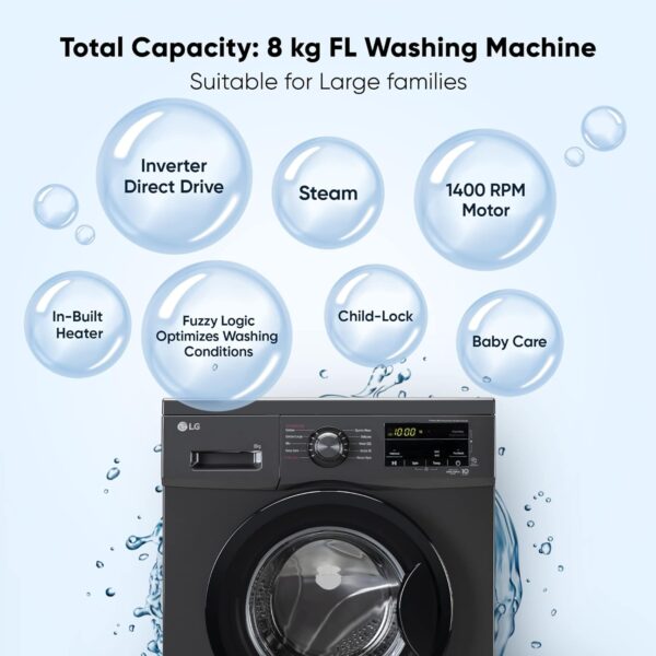 LG 8 Kg 5 Star Inverter Direct Drive Touch Panel Fully Automatic Front Load Washing Machine (FHM1408BDM, Steam for Hygiene, In-Built Heater, 6 Motion DD, Middle Black)