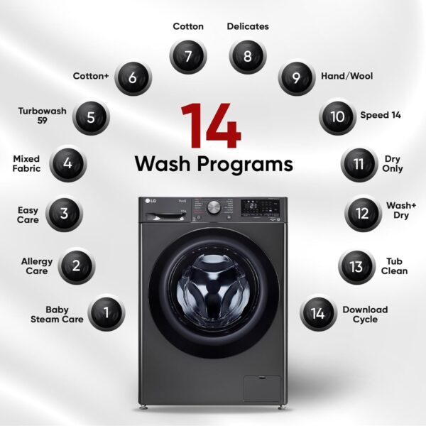 Wash Programs: 14 No. of Programs – Cotton, Cotton+, TurboWash 59, Mixed Fabric, Easy Care, Allergy Care, Baby Steam Care, Delicates, Hand/Wool, Speed 14, Dry Only, Wash+Dry (5 Kg), Tub Clean & Download Cycle | Can be downloaded multiple wash programs using LG ThinQ App