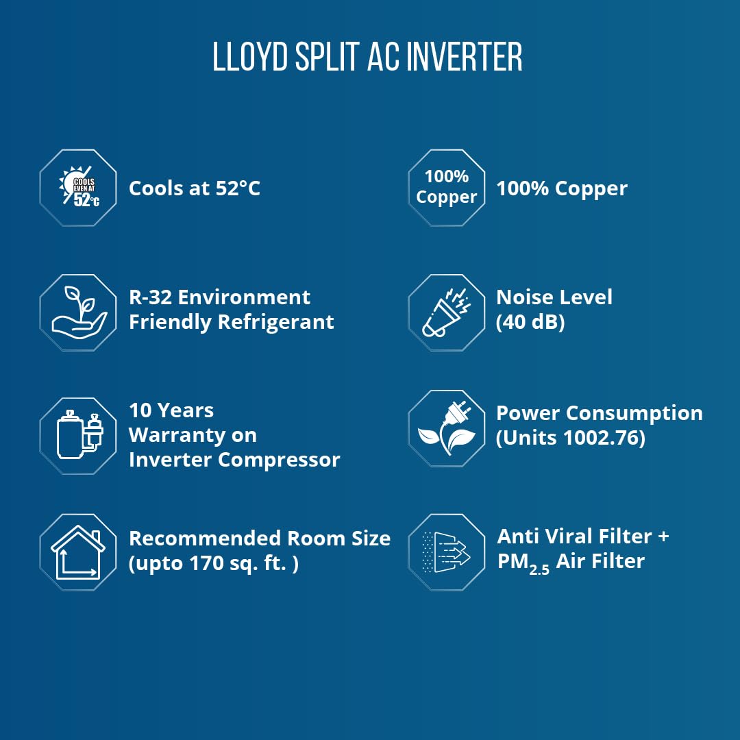 - Lloyd Split AC with Inverter Compressor: AC with variable speed compressor which automatically adjusts power depending on room temperature & heat load. Convertible / adjustable with 5 cooling modes through remote control to operate in different tonnages for different cooling needs (40% to 100% capacity)
