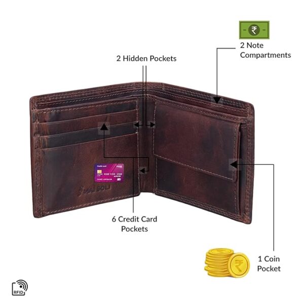 PRODUCT FEATURES – This wallet is made of 100% Genuine Leather and has built-in RFID blocking technology. || There are 6 Credit Card Pockets, 1 Coin Pocket, 2 Hidden Pockets and 2 Note Compartments. || High quality drill lining is used on the note compartments, which is soft to touch and does not tear. || The Dimensions (L*B*H) are 11.2*1.5*9.4″CM and weight is 70gm. || This wallet comes in a special Mai Soli Gift Box packaging.