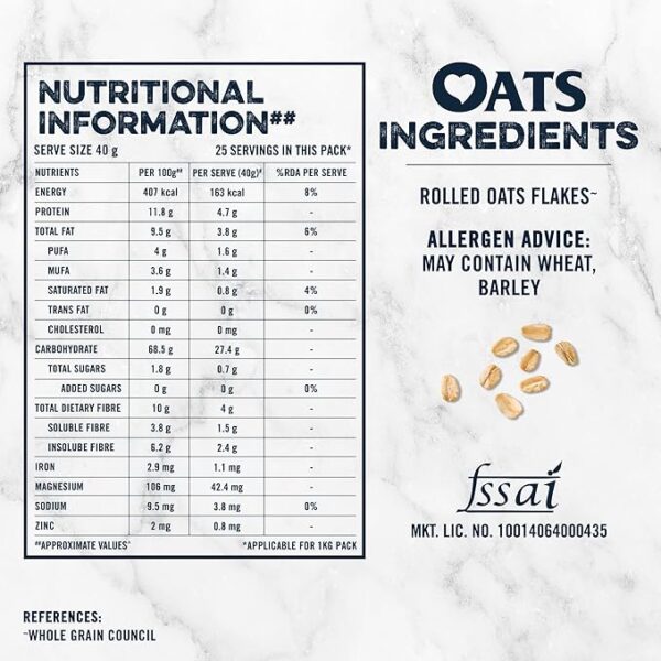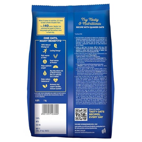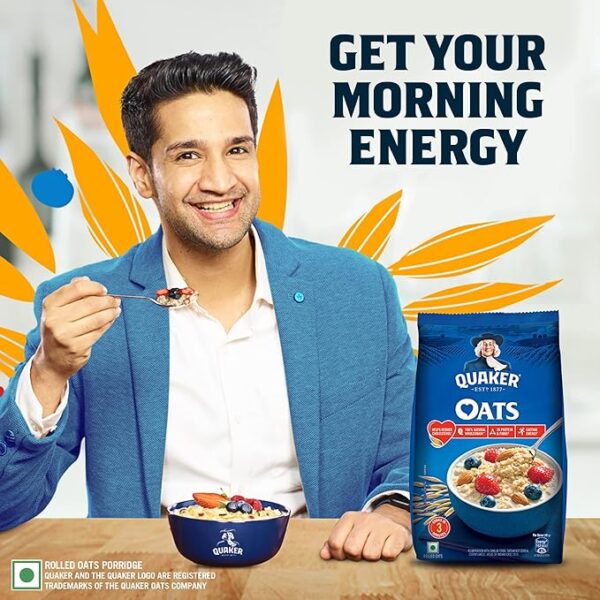 RICH IN FIBRE and a good SOURCE OF PROTEIN; LASTING ENERGY: Start your day with a bowl of nutritious Quaker Oats, 100% Natural Wholegrain Oats contain complex carbohydrates that break down slowly to provide lasting energy
