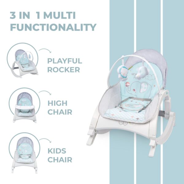 • 3 in 1 Functionality: This rocker can be easily turned into a rocker or high chair or a kid’s chair as and when required. It also comes with a portable meal tray to feed your baby with ease.