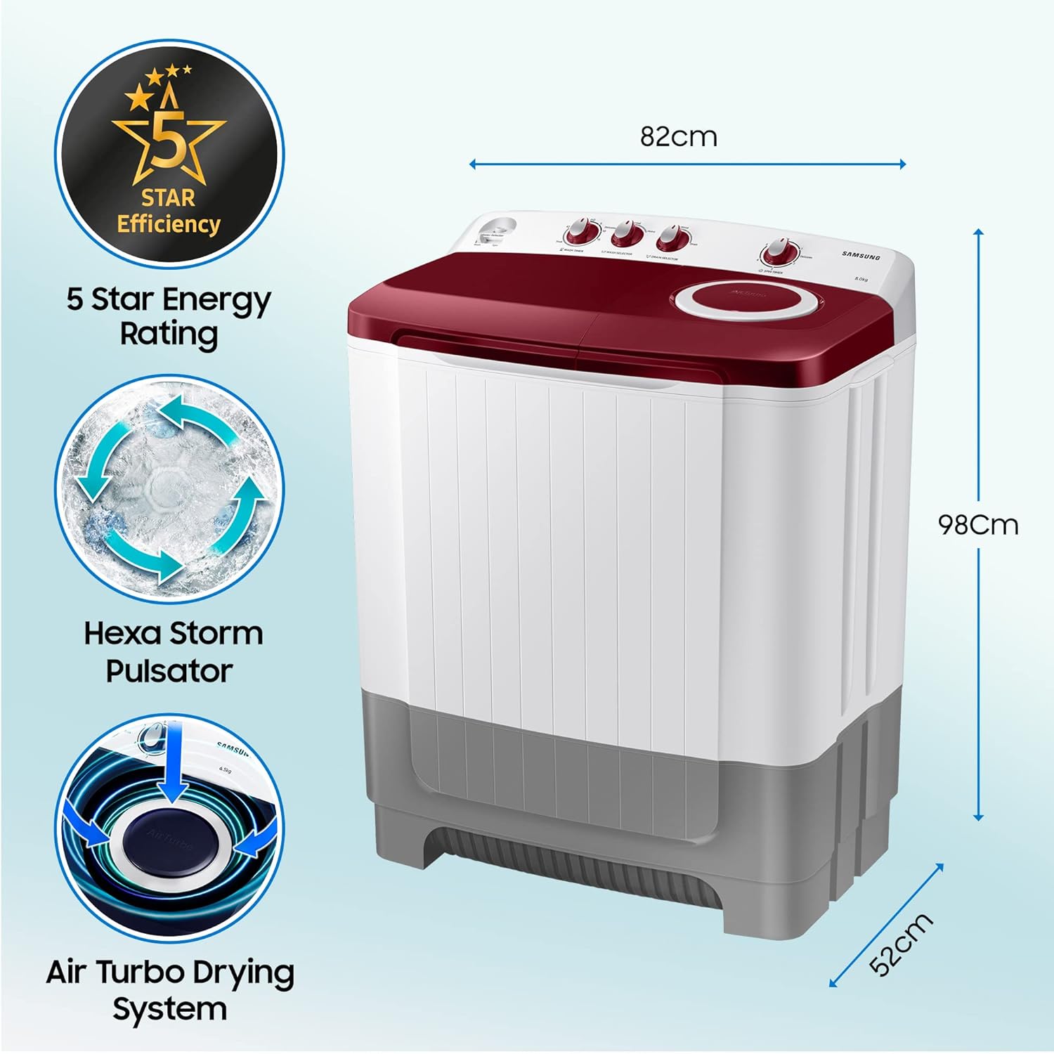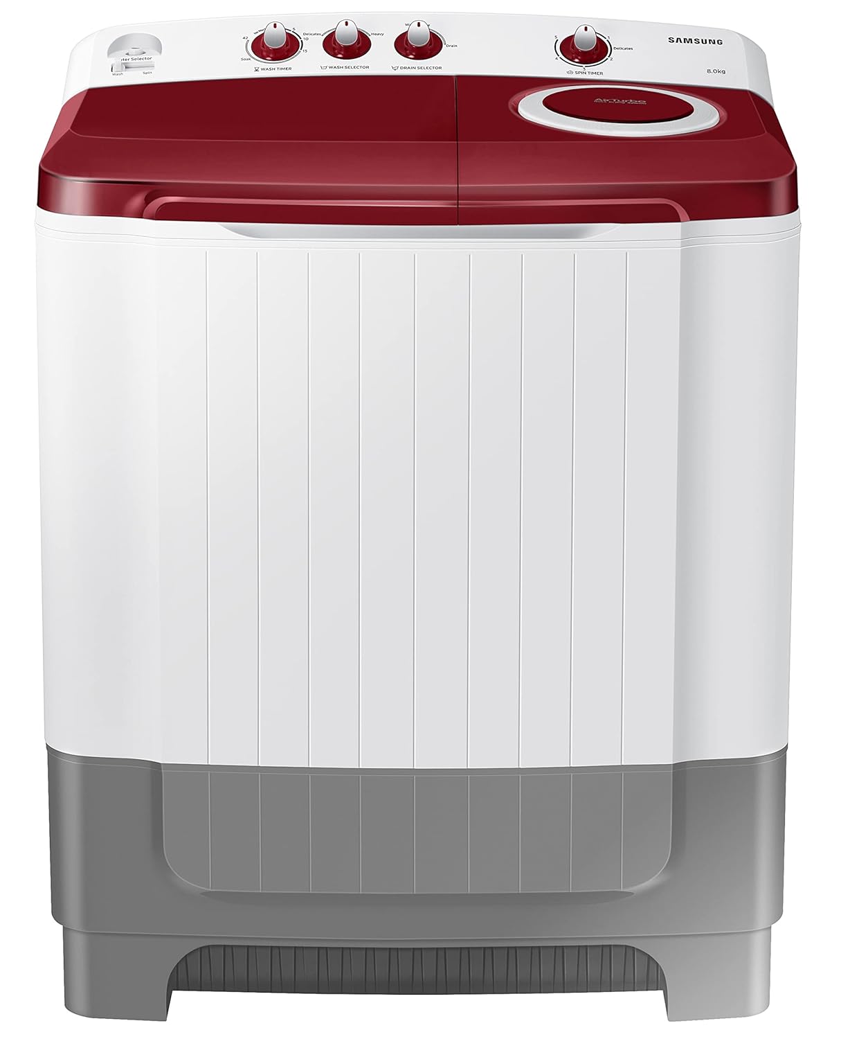 Samsung 8.0 Kg Semi-Automatic 5 Star Top Loading Washing Machine (WT80R4000RG/TL, Light Grey, Wine Red Lid (Opaque), Hexa Storm Pulsator)