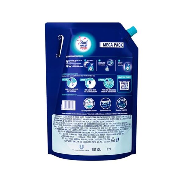 Surf Excel Matic Top Load Liquid Detergent 3.2 L Refill, Designed for Tough Stain Removal on Laundry in Washing Machines – Mega Pack (Package may differ)