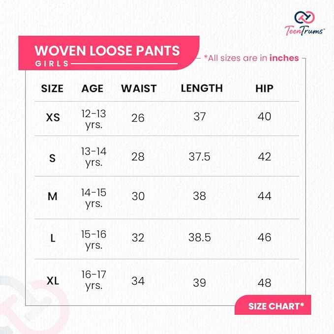 Our custom-made sizes for teenage girls ensure a perfect fit for ages 16-17 years. Whether you’re looking for trendy track pants or versatile casual wear, we’ve got you covered.