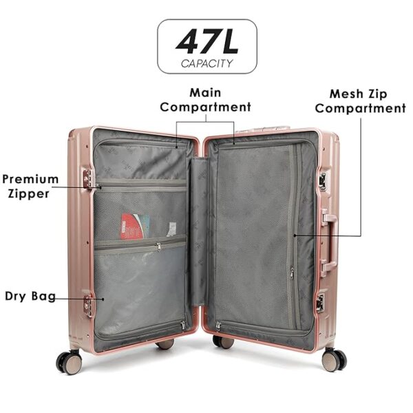 ➧ STORAGE CAPACITY: 22 inch bag size: 36 cm (L), 23 cm (W), 57 cm(H). Capacity: 47 litres. Weight: 3.4 Kg. The speciality of this trolley suitcase is that it can be opened by two TSA locks for security. Provided with a spacious main compartment with five inner zip closed meshed pockets to keep all your travel items safely. You can organize the wet & dry clothes separately or store other necessities in place. This trolley bag is useful during long travels.
