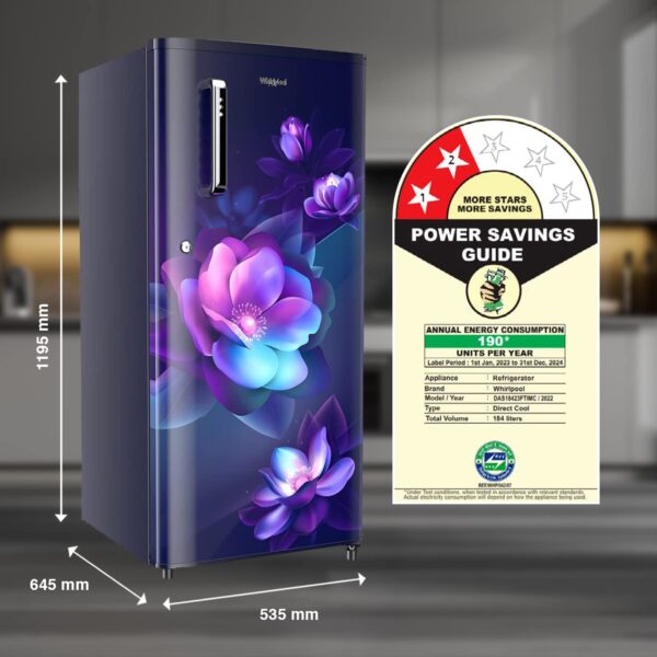 Whirlpool 184 L 2 Star Direct-Cool Single Door Refrigerator (205 WDE PRM 2S SAPPHIRE BLOOM-Z, 2023 Model)